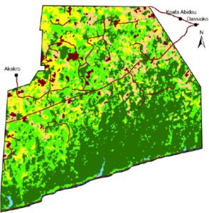 Les résultats obtenus indiquent une dégradation importante de cet écosystème. Ainsi, sur la période de l’étude, la forêt dense primaire a perdu 1 911 hectares, soit 34 % de son étendue, passant de 5 560 hectares en 2001 à 3 649 hectares en 2013. Les surfaces de forêts denses primaires ont reculé au profit des forêts secondaires et des parcelles agricoles qui ont gagnées respectivement 983 hectares et 1 620 hectares. Par ailleurs, les secteurs situés à moins de 5 kilomètres au Nord-est et au Nord-ouest de la forêt classée abritent de fortes densités de populations comprises entre 26 et 53 habitants au kilomètre carré. Enfin, à l’intérieur de la forêt classée, les espaces agricoles et les ilots de forêts secondaires constituent 70 % des unités d’occupation du sol observées à une distance de 750 mètres autour des pistes et routes.